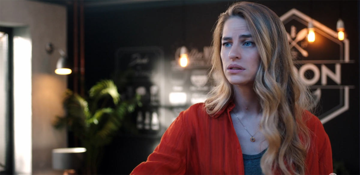 Aaron se rend dans le bar pour le rendez-vous avec sa cliente : elle arrive en retard, c’est Laurie Coulbaux.